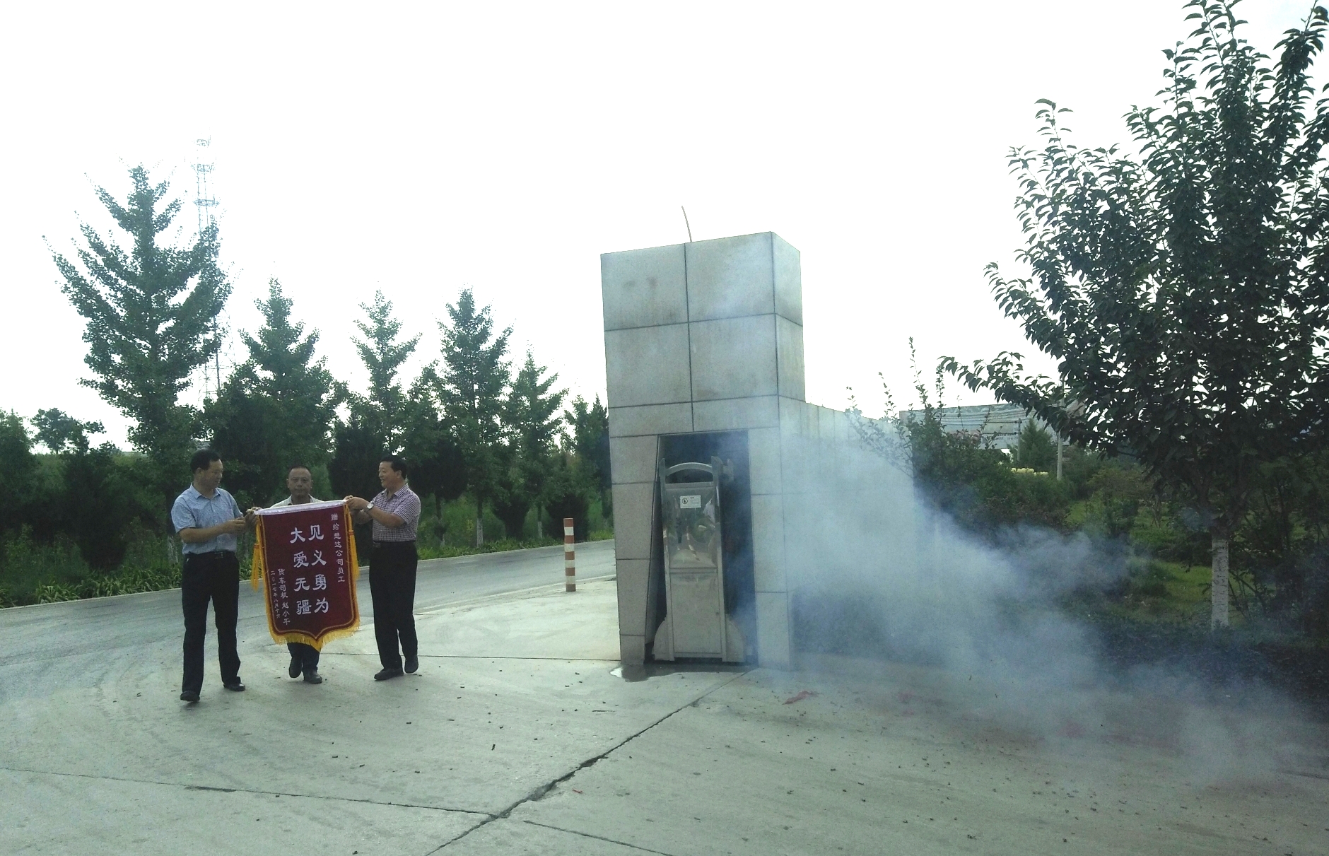 8月15日上午,趙小平帶著錦旗和感謝信來到懋達公司,專程來致謝王小龍、岳克斌、岳涵、陳興銀等見義勇為的好心人。