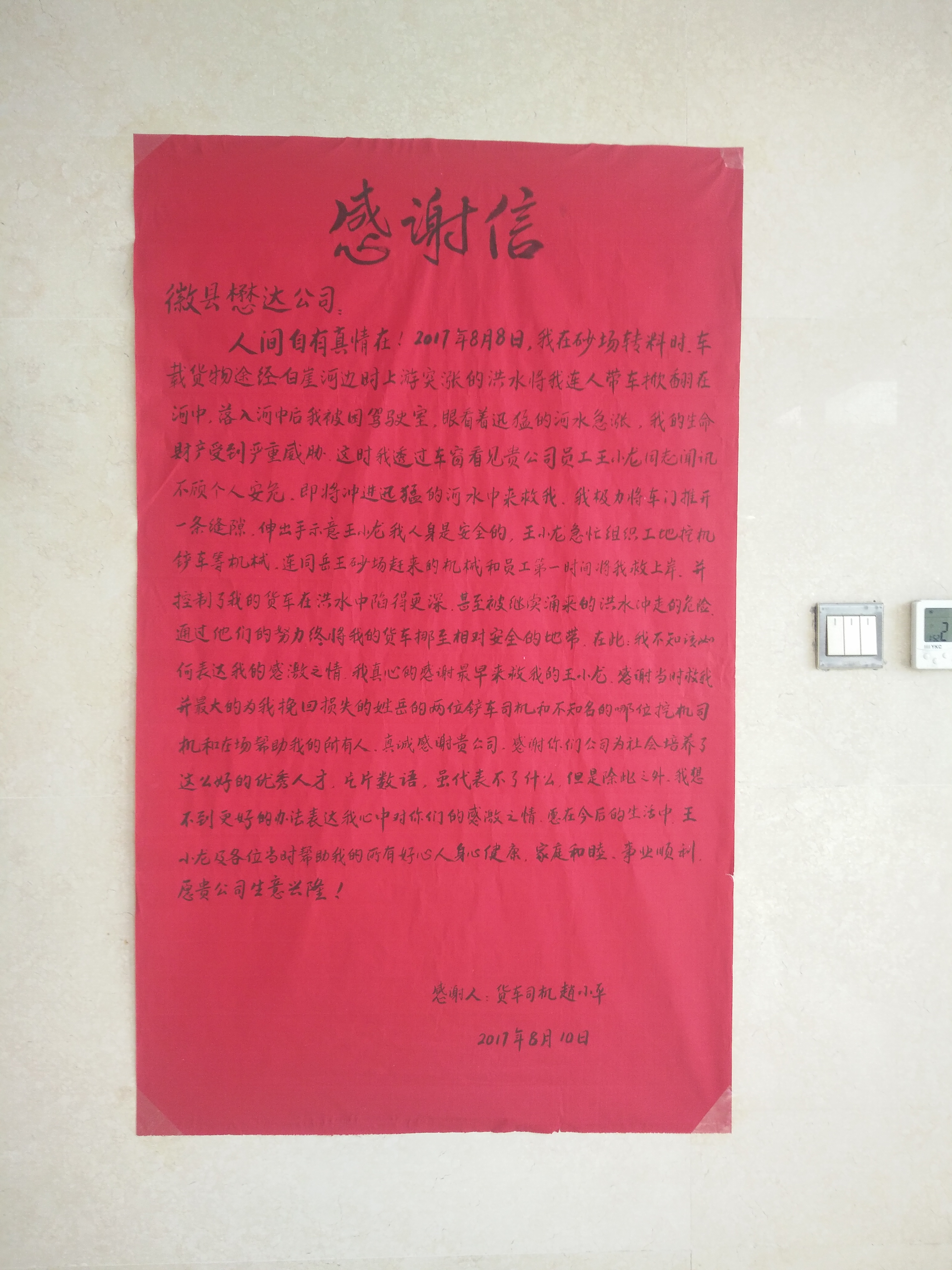 趙小平說:“8月8日中午,我駕駛貨車途徑柳林白崖河,由于突降暴雨、河水猛漲,洪水將我連人帶車掀翻至河中,我被困在駕駛室,當時生命和財產(chǎn)受到了嚴重威脅。這時,貴公司王小龍立即向我伸出援手,在第一時間組織工地挖機、鏟車等機械,連同岳克斌、岳涵、陳興銀等員工一起,順利將我救上岸,并及時控制了我的貨車沒有陷的更深。在此我表示深深地謝意,感謝貴公司為社會培養(yǎng)這么好的優(yōu)秀人才,愿幫助我的幾位好心人身體健康、家庭和睦、事業(yè)順利,愿貴公司生意興隆!