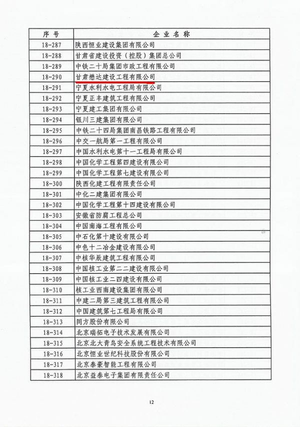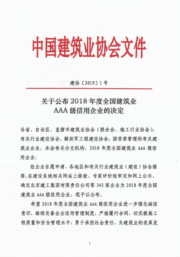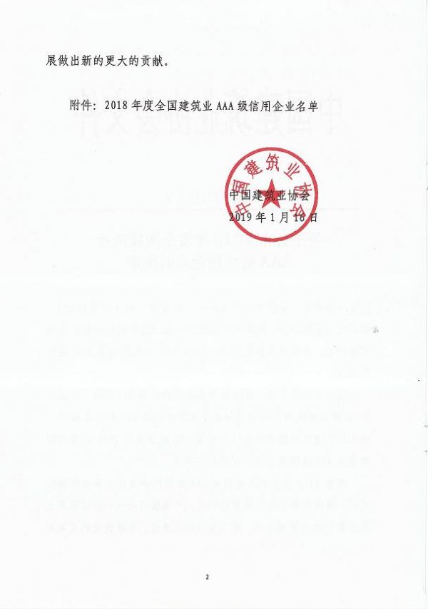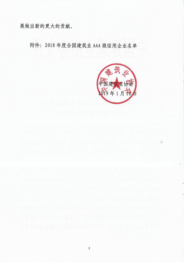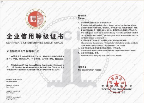 近日,中國建筑業(yè)協(xié)會公布了2018年度全國建筑業(yè)AAA級信用企業(yè)評價結果,甘肅懋達建設工程有限公司獲評“2018年度全國建筑業(yè)AAA級信用企業(yè)”榮譽稱號。