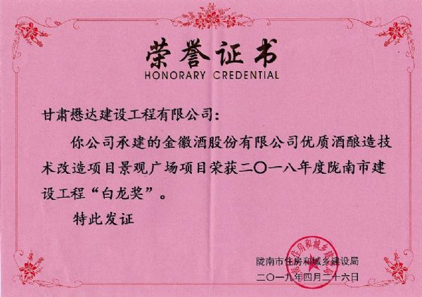 近日,在隴南市2019年建設(shè)工程質(zhì)量安全監(jiān)管工作視頻會(huì)議上,公司承建的金徽酒股份有限公司優(yōu)質(zhì)酒釀造技術(shù)改造項(xiàng)目景觀廣場項(xiàng)目榮獲2018年度隴南市建設(shè)工程“白龍獎(jiǎng)”。