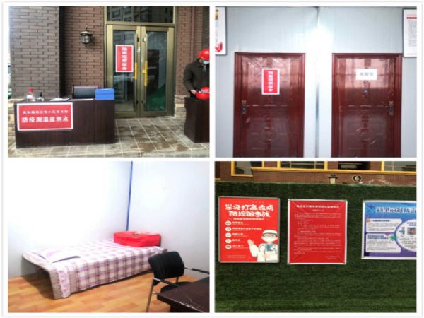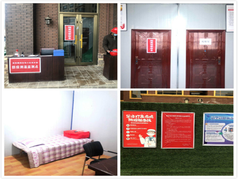 工地現(xiàn)場疫情檢測點、隔離觀察室及宣傳海報。