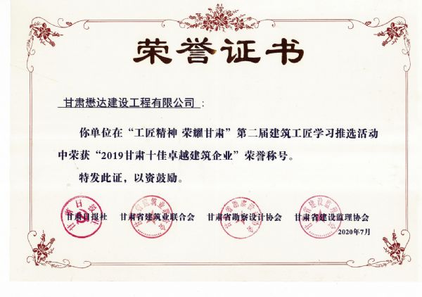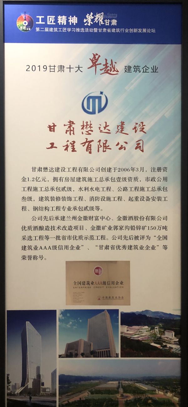 7月3日,“工匠精神,榮耀甘肅”第二屆建筑工匠學(xué)習推選活動暨甘肅省建筑行業(yè)創(chuàng)新發(fā)展論壇在蘭州市舉辦。會議揭曉了第二屆建筑工匠學(xué)習推廣活動評選結(jié)果,甘肅懋達建設(shè)工程有限公司獲得“2019甘肅十佳卓越建筑企業(yè)”榮譽稱號。