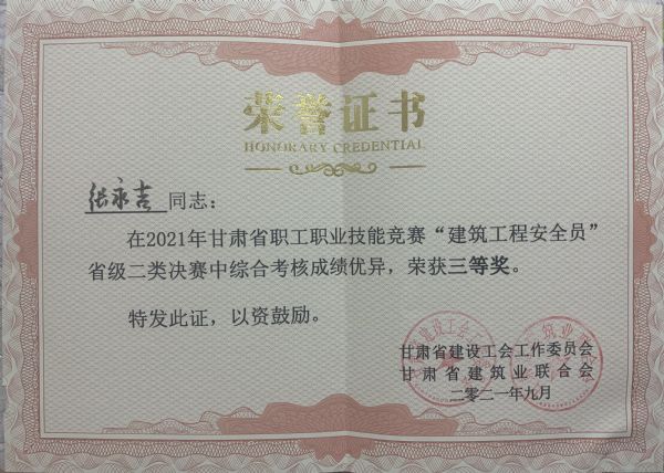 競賽依據(jù)建筑行業(yè)相關(guān)安全法律法規(guī)及標(biāo)準(zhǔn)規(guī)范,由理論知識考試和實(shí)際操作考核兩個模塊組成,來自全省的25個代表隊的50名安全員參加了此次競賽活動。經(jīng)過一天的激烈角逐,張永吉排名全省第十,榮獲甘肅省職工職業(yè)技能競賽“建筑工程安全員”省級二類決賽三等獎;張宏明榮獲優(yōu)秀選手榮譽(yù)稱號。
