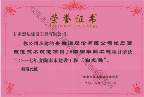 金徽酒股份有限公司優(yōu)質酒釀造技術改造項目2#釀酒車間工程--2017年度隴南市白龍獎