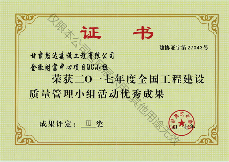 金徽財富中心項目QC小組---2017年度全國工程建設(shè)質(zhì)量管理小組活動優(yōu)秀成果III類